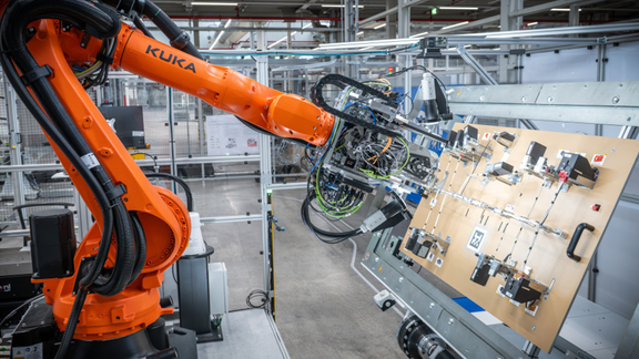 A demonstrator funded by the Federal Ministry for Economic Affairs and Energy has been created in Ingolstadt that maps the entire process chain: from wiring loom production and pre- assembly in the center console with automation-compatible connectors to automated installation in the vehicle – controlled by a central system. The benefits for Audi are considerable: less logistical effort and significantly shorter lead times for changes – minutes instead of weeks. The next step is to incorporate the knowledge gained into the large-scale production of future vehicle projects.