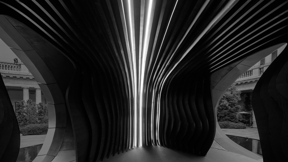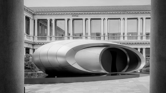 “Origin” distills the essence of progress – leaving only what is necessary, cutting away the superfluous to reveal pure intention. Located in the courtyard of the former Archiepiscopal Seminary – today the Portrait Hotel on Corso Venezia – the sculptural object delicately interacts with its historic surroundings. The structure evolves continuously throughout the day. Shifting reflections and shadows redraw the space, and surfaces reveal new details as visitors move. The architecture itself becomes a calming counterpoint to the sensory intensity of the city. Its matte metallic skin, reminiscent of technical materials such as titanium, subtly absorbs and reflects the chromatic tones of the courtyard. This creates a dialogue between contemporary design and the rich architectural heritage of Milan. More than an object, “Origin” is a living spatial experience – an invitation to step into a moment of quiet presence amid the pace of modern life