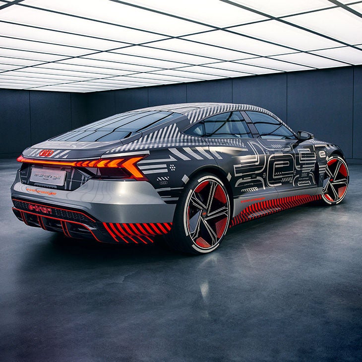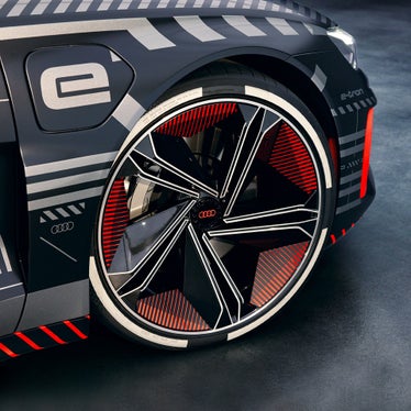 Improved aerodynamic resistance reduces consumption and increases range. In this way and fully in the spirit of Vorsprung durch Technik, the wind tunnel had a decisive influence on the design of the Audi e-tron GT concept¹. This can be seen in the design of the bonnet, which reduces unwanted turbulence. Even the design of the 22-inch wheels with five twin spokes allows for optimum ventilation of the brake discs and reduces air resistance. Meanwhile at the rear, a large diffuser minimises bounce. Playing a decisive role in saving weight is the chassis, which follows a multimaterial lightweight design incorporating aluminium and steel as well as a carbon roof.